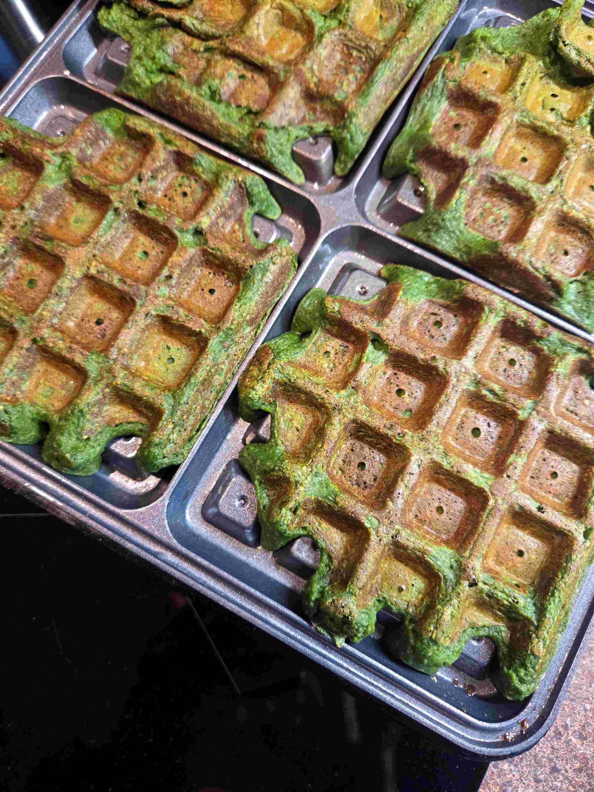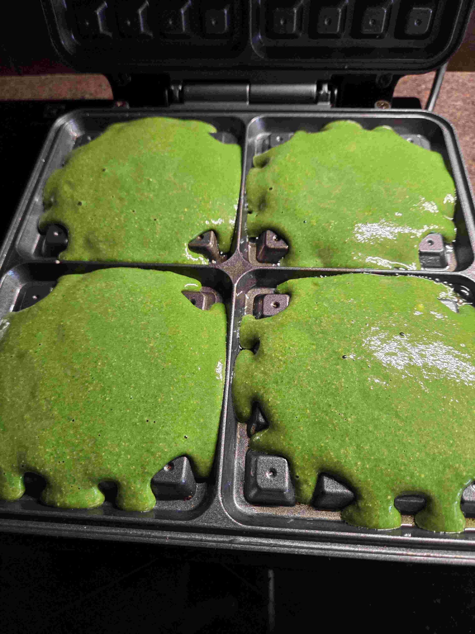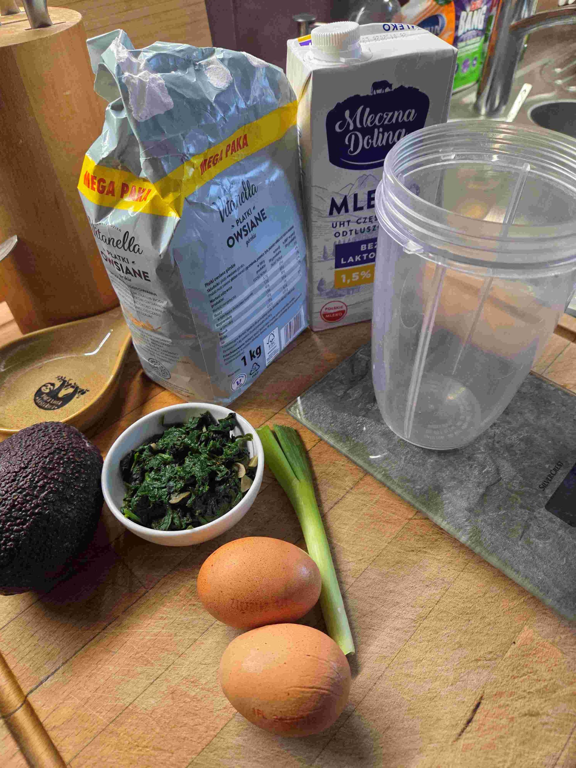 Jajko, płatki owsiane (50 g), zarodki pszenne, płatki drożdżowe, 150 ml mleka, 100 g szpinaku baby uprzednio przesmażonego z czosnkiem - zblendować na gładka masę. Z tej ilości wyszły 4 sztuki.