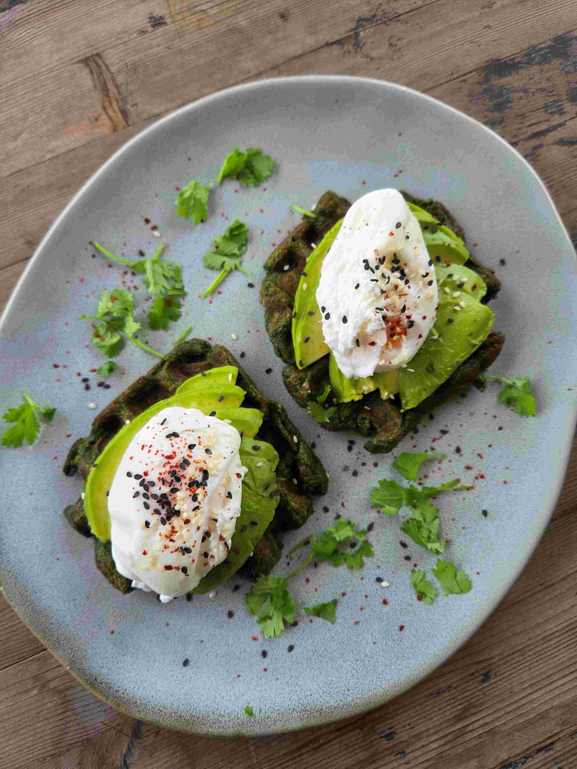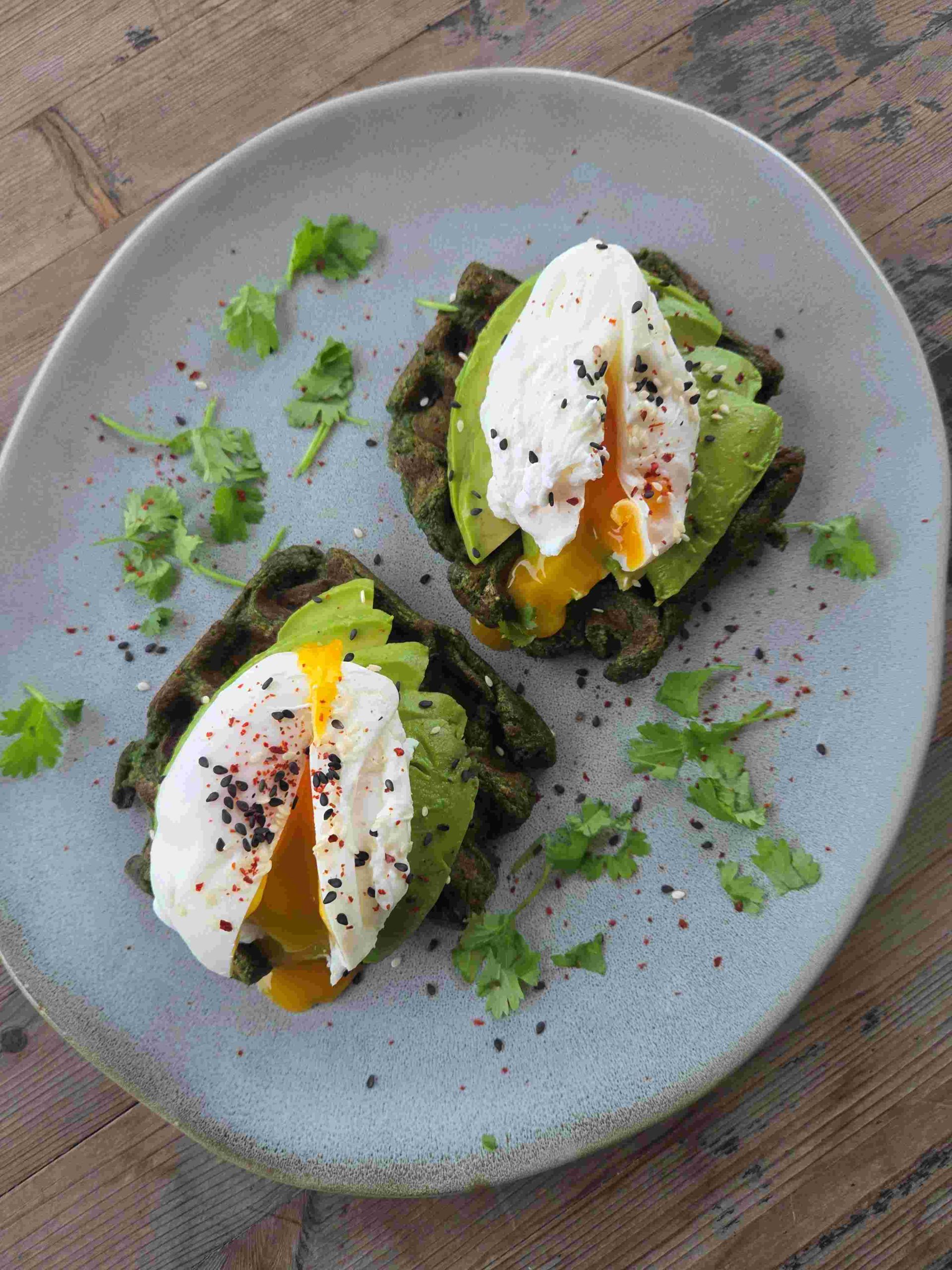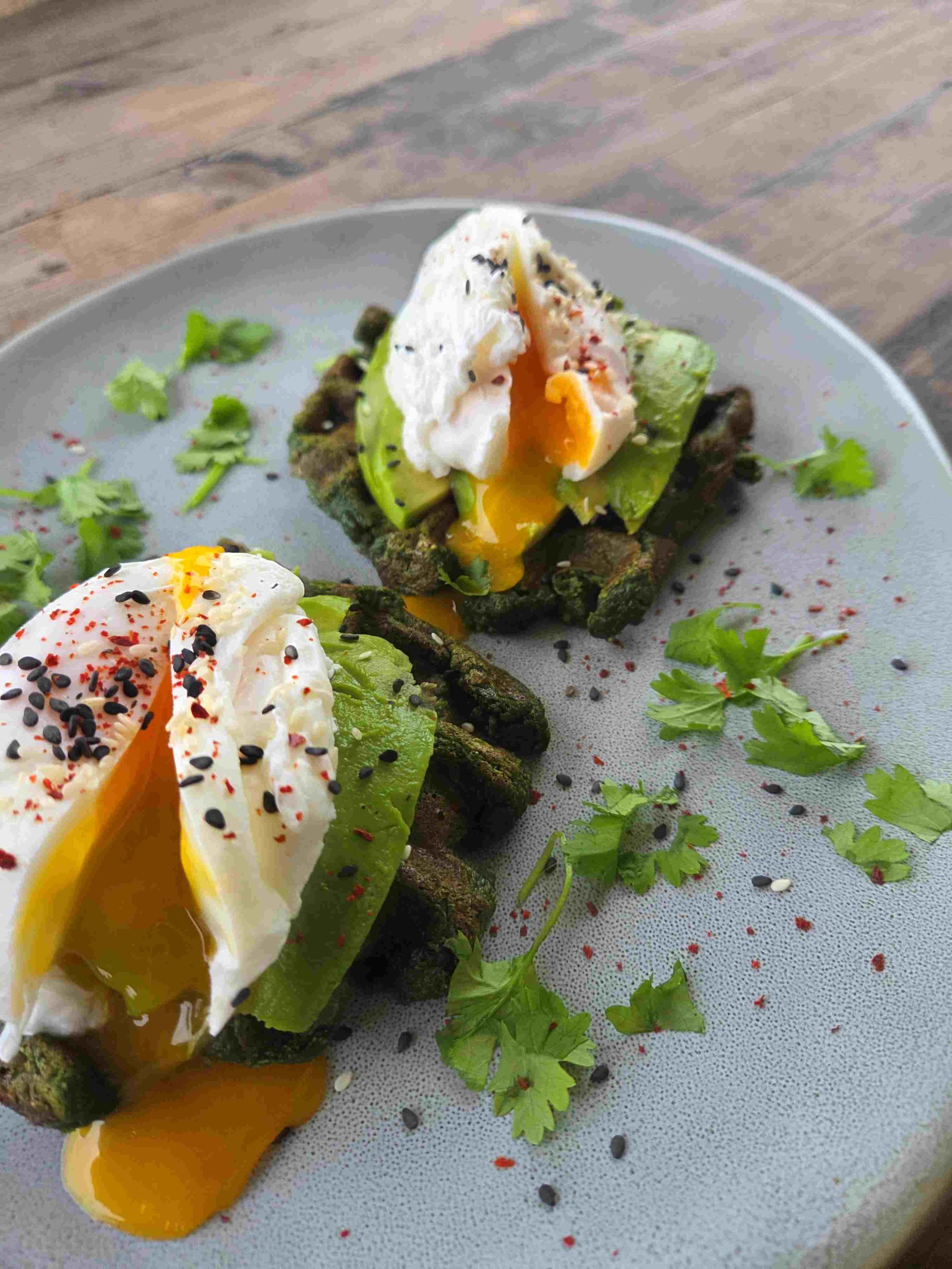 Na każdego gofra ułożyłam 1/4 awokado w plasterkach, a na wierzch po jajku poszetowym.