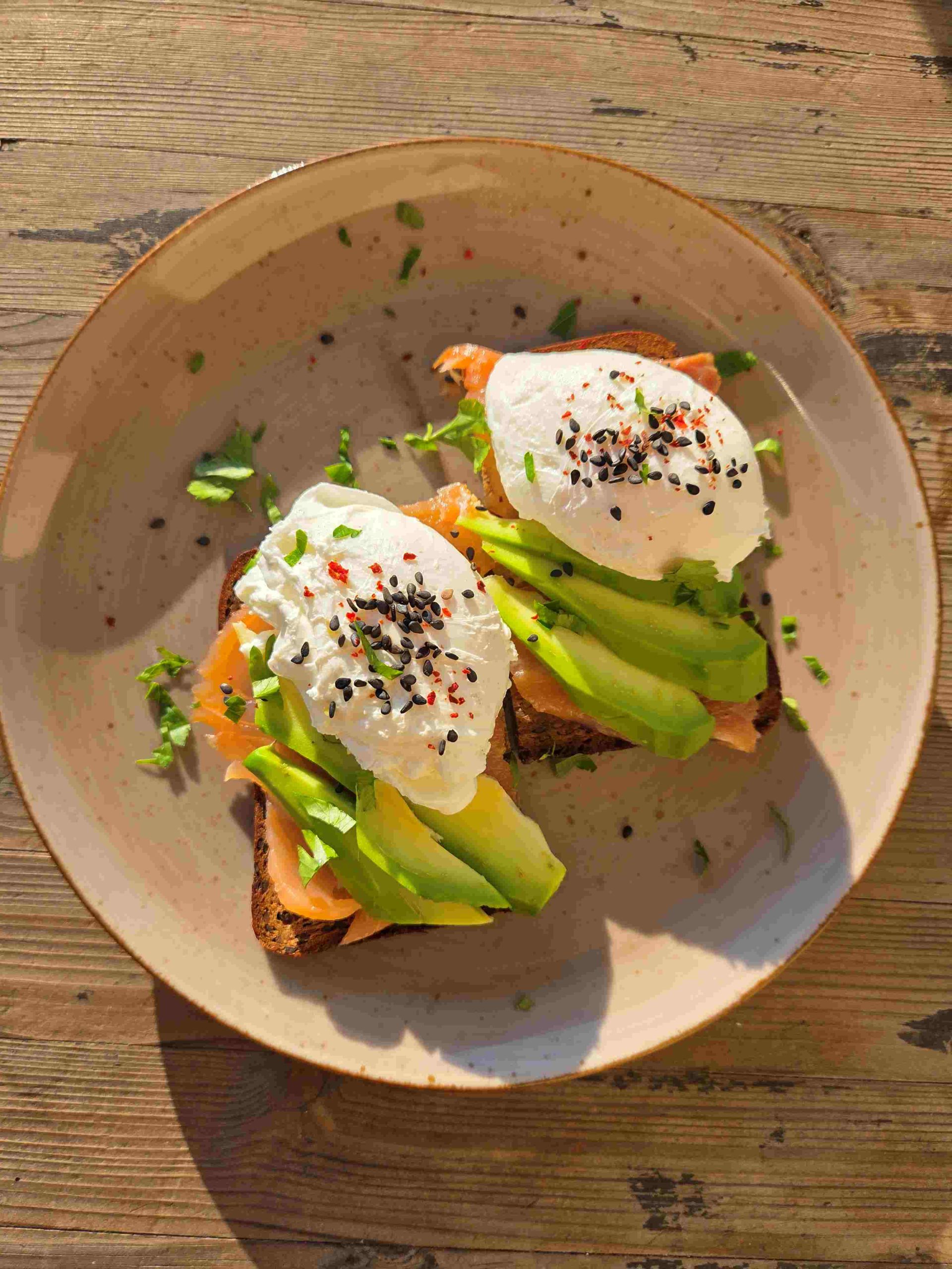 Bardzo pożywne, smaczne i sycące śniadanie (lub kolacja?) - składniki ogólnie dostępne, niejakim problemem może być przygotowanie jajek poszetowych (w koszulce). Jednak zachęcam, bo takie jajka są i zdrowe, i smaczne, i efektowne.
