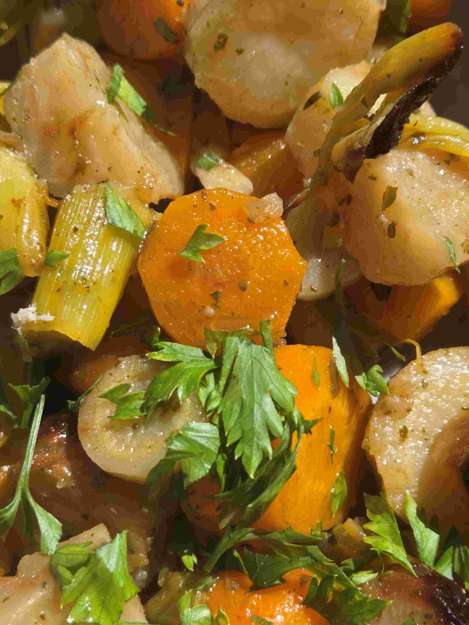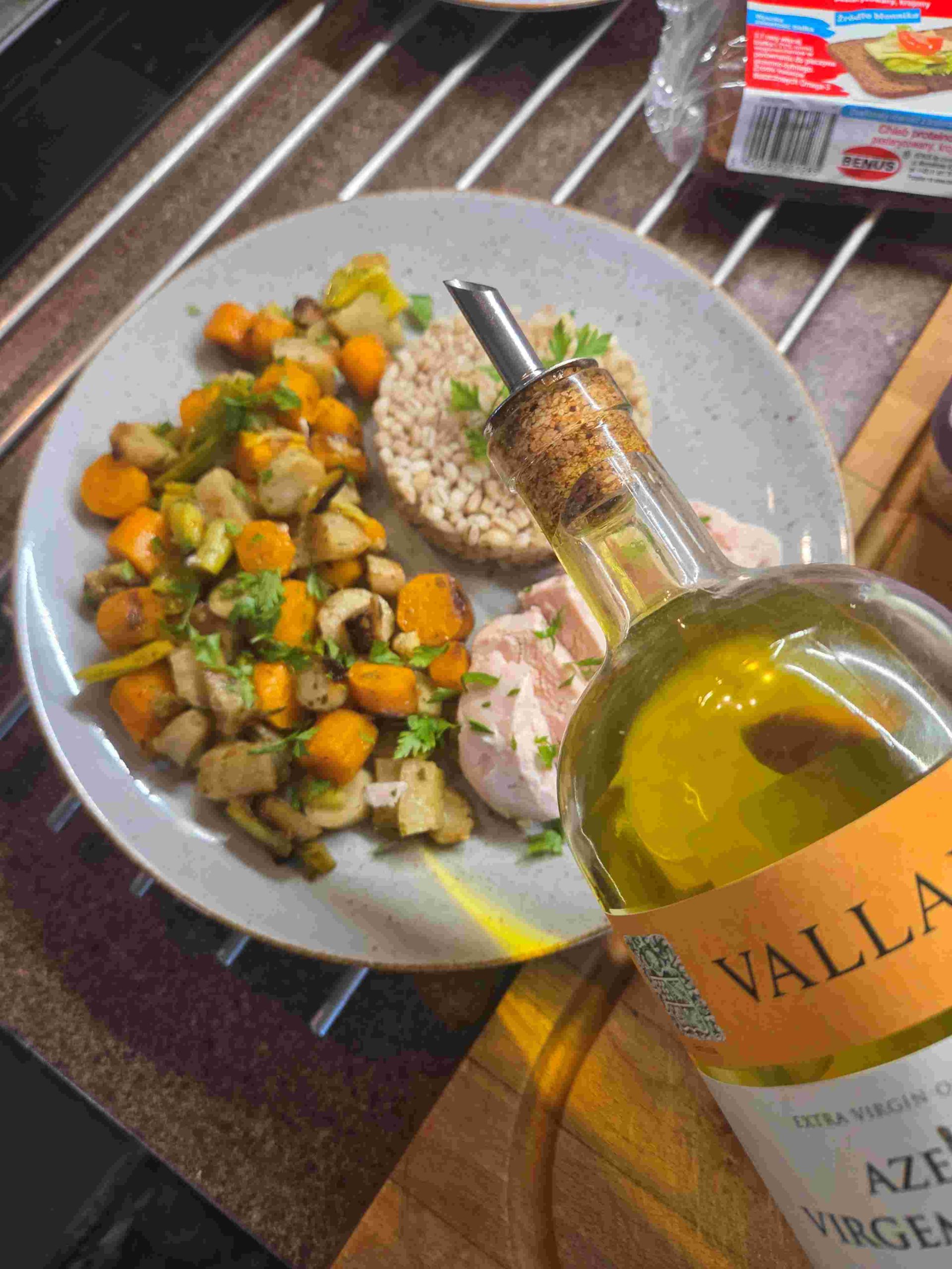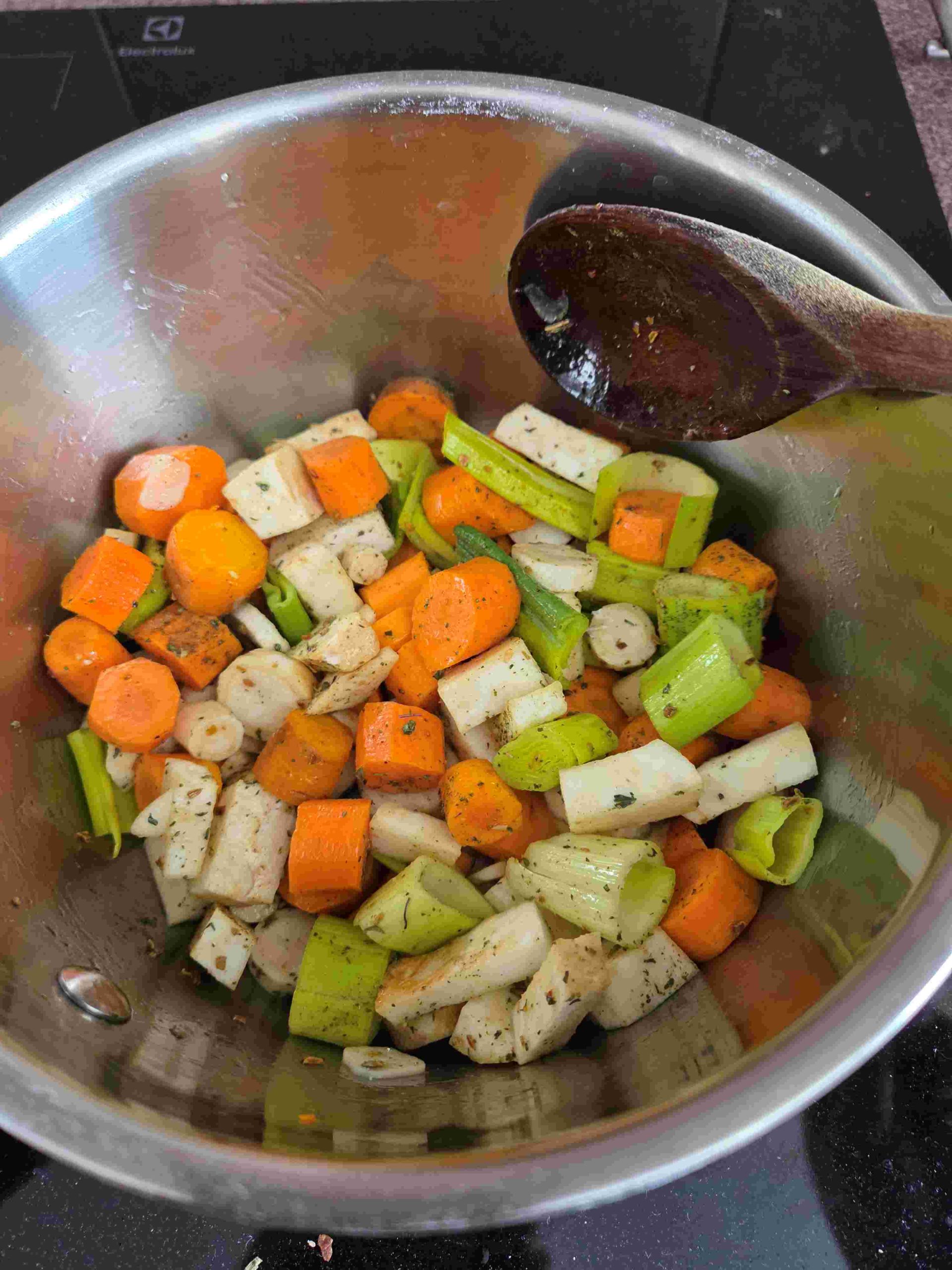 Warzywa oczyściłam, pokroiłam w większe kawałki, doprawiłam ziołami (cząber, tymianek, czosnek, oregano). Podlałam odrobiną wody i dusiłam pod przykryciem na małym ogniu, aż były al dente. Od czasu do czasu sprawdzałam ilość płynu i uzupełniałam, żeby się nie przypaliły.