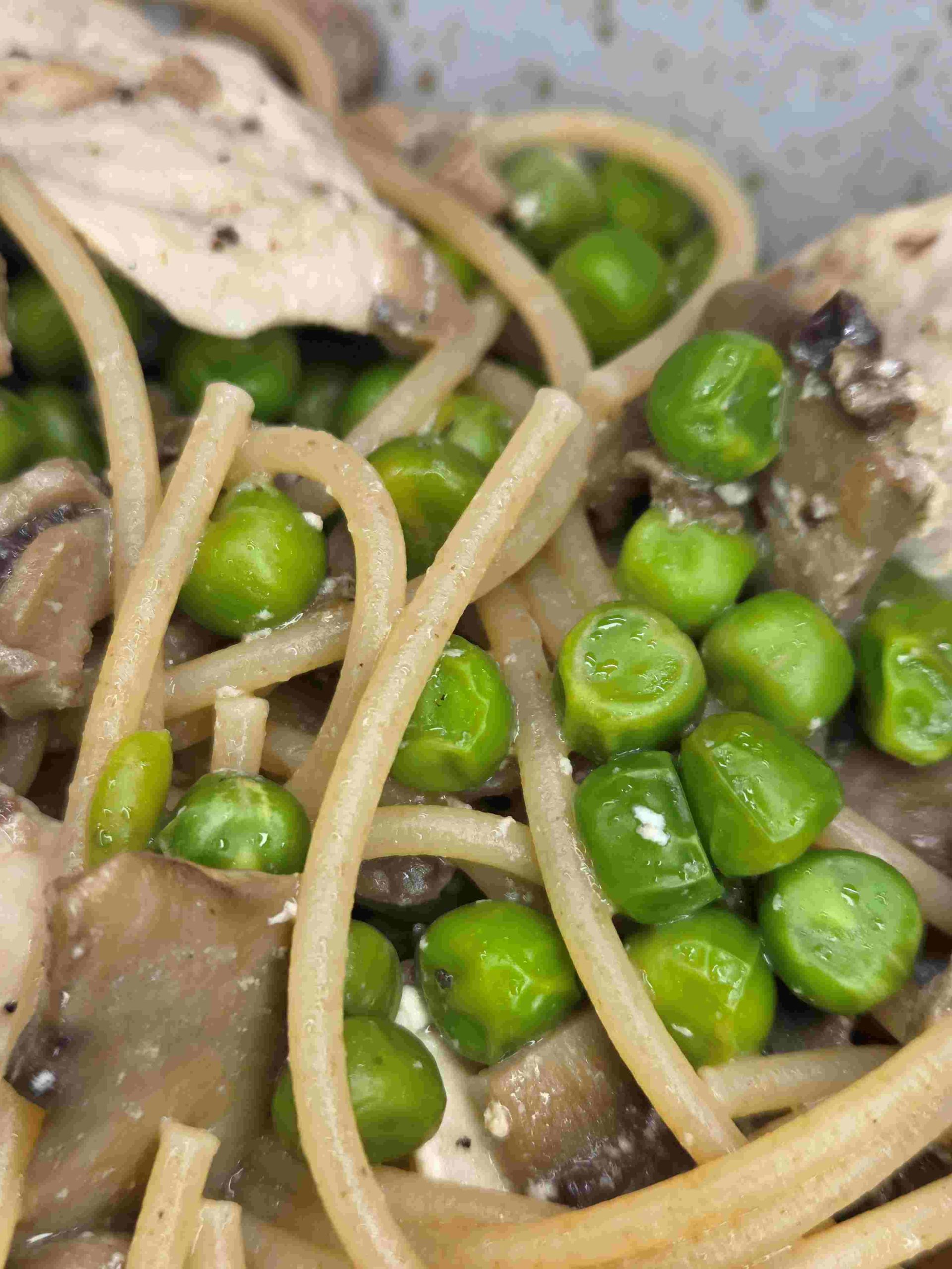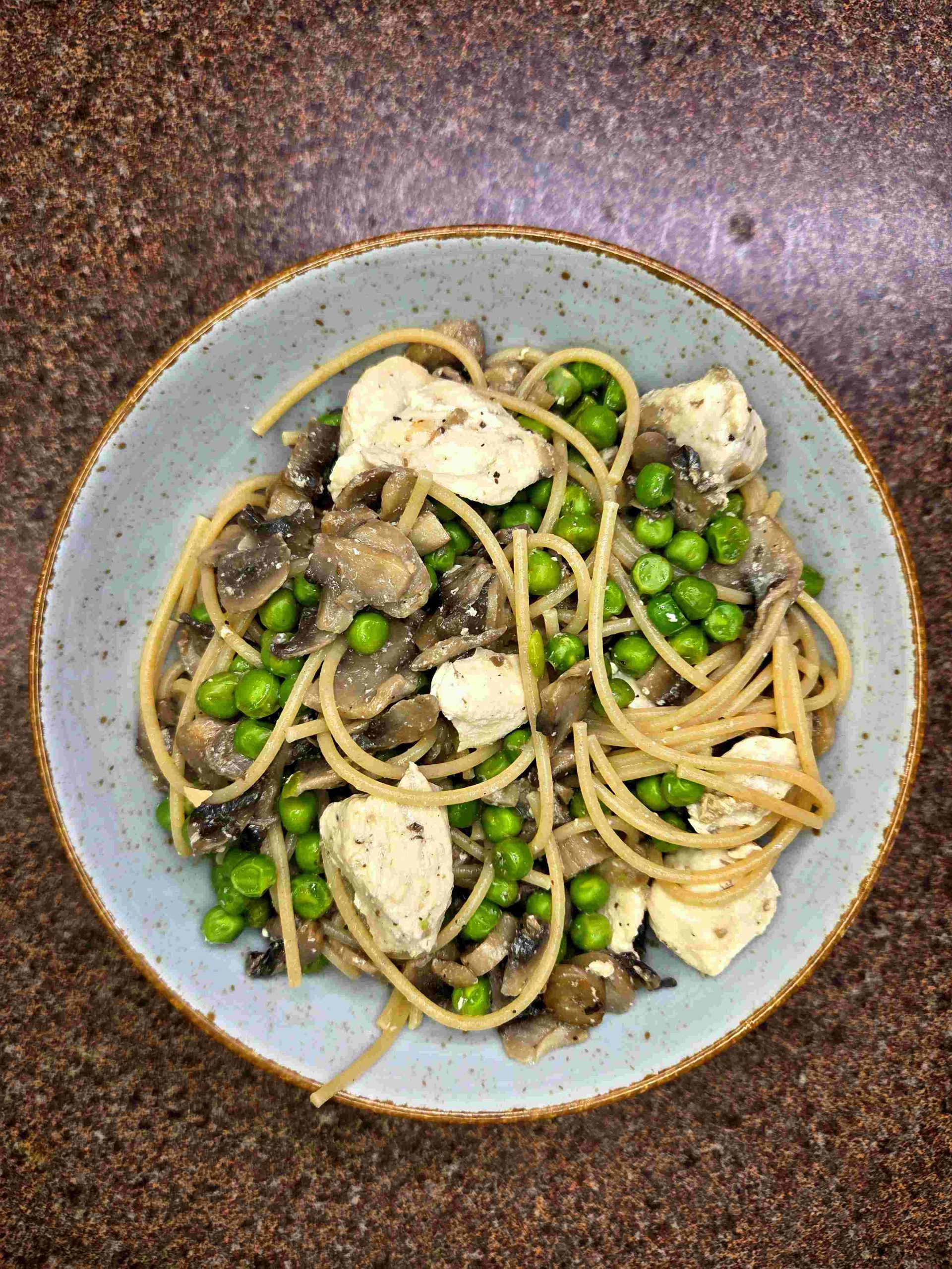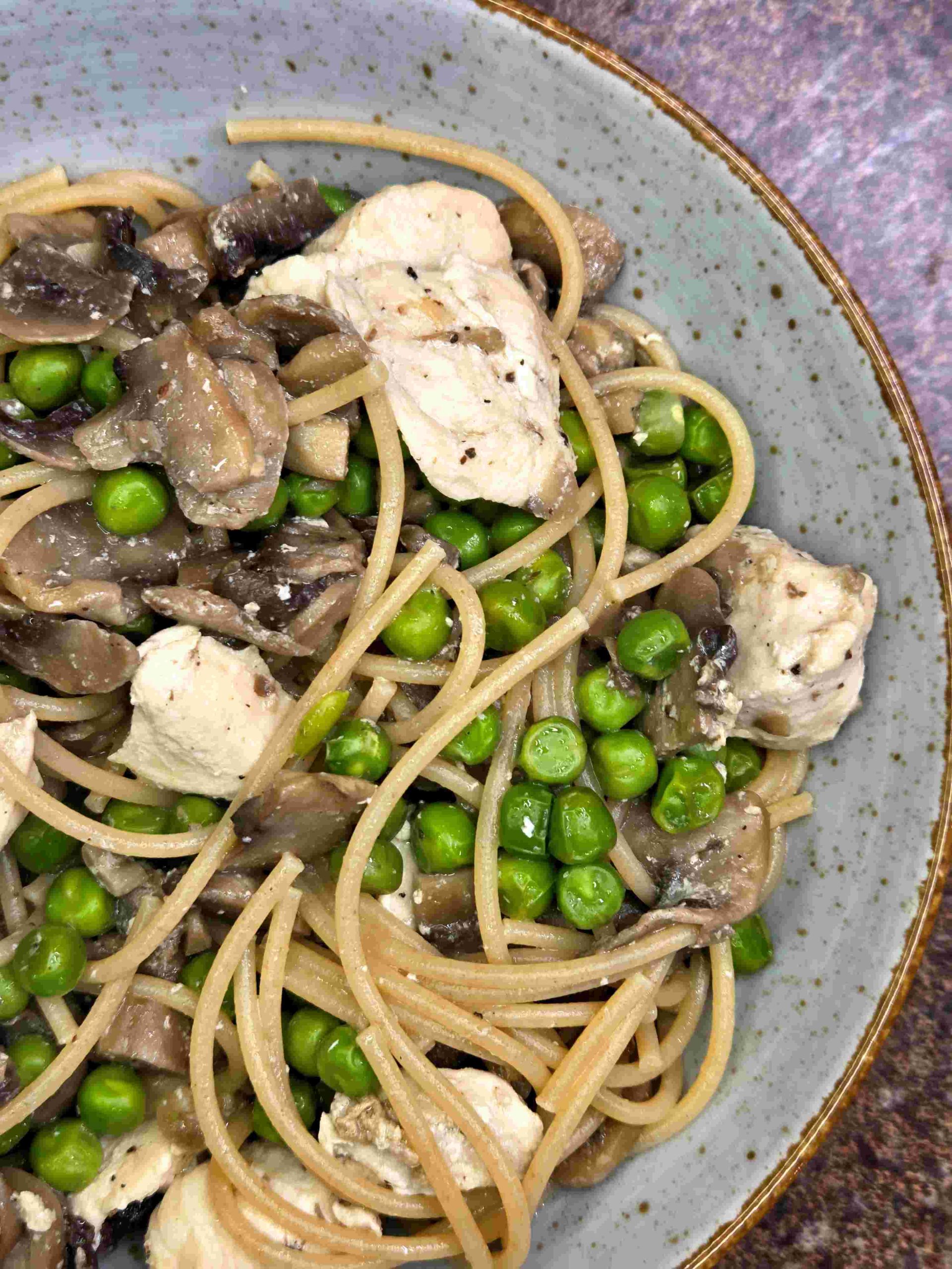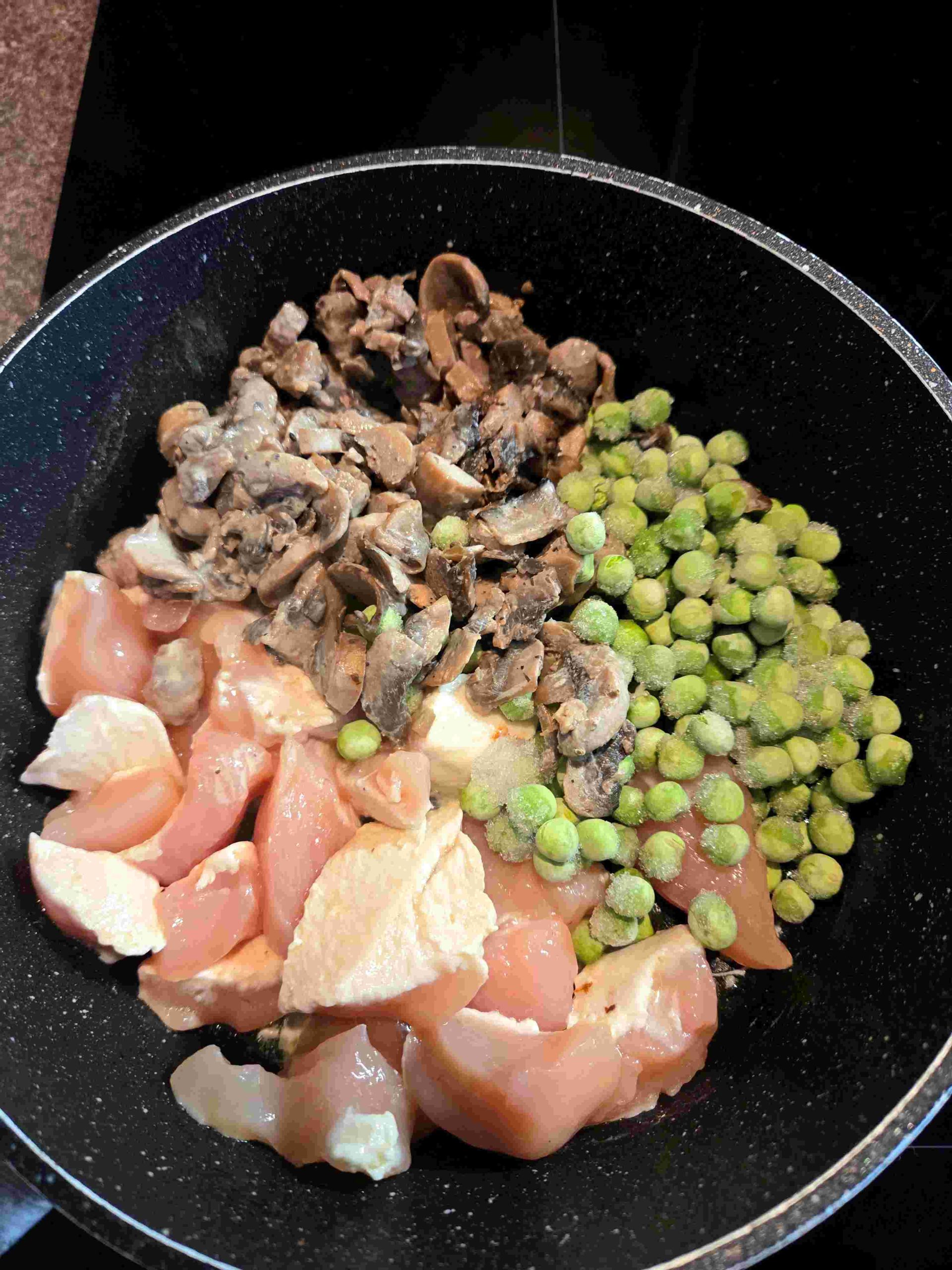 Pieczarki wcześniej poddusiłam w śmietanie, dodałam pokrojoną w kostkę pierś kurczaka i mrożony groszek. Doprawiłam solą o pieprzem i dusiałam pod przykryciem aż mięso było gotowe.