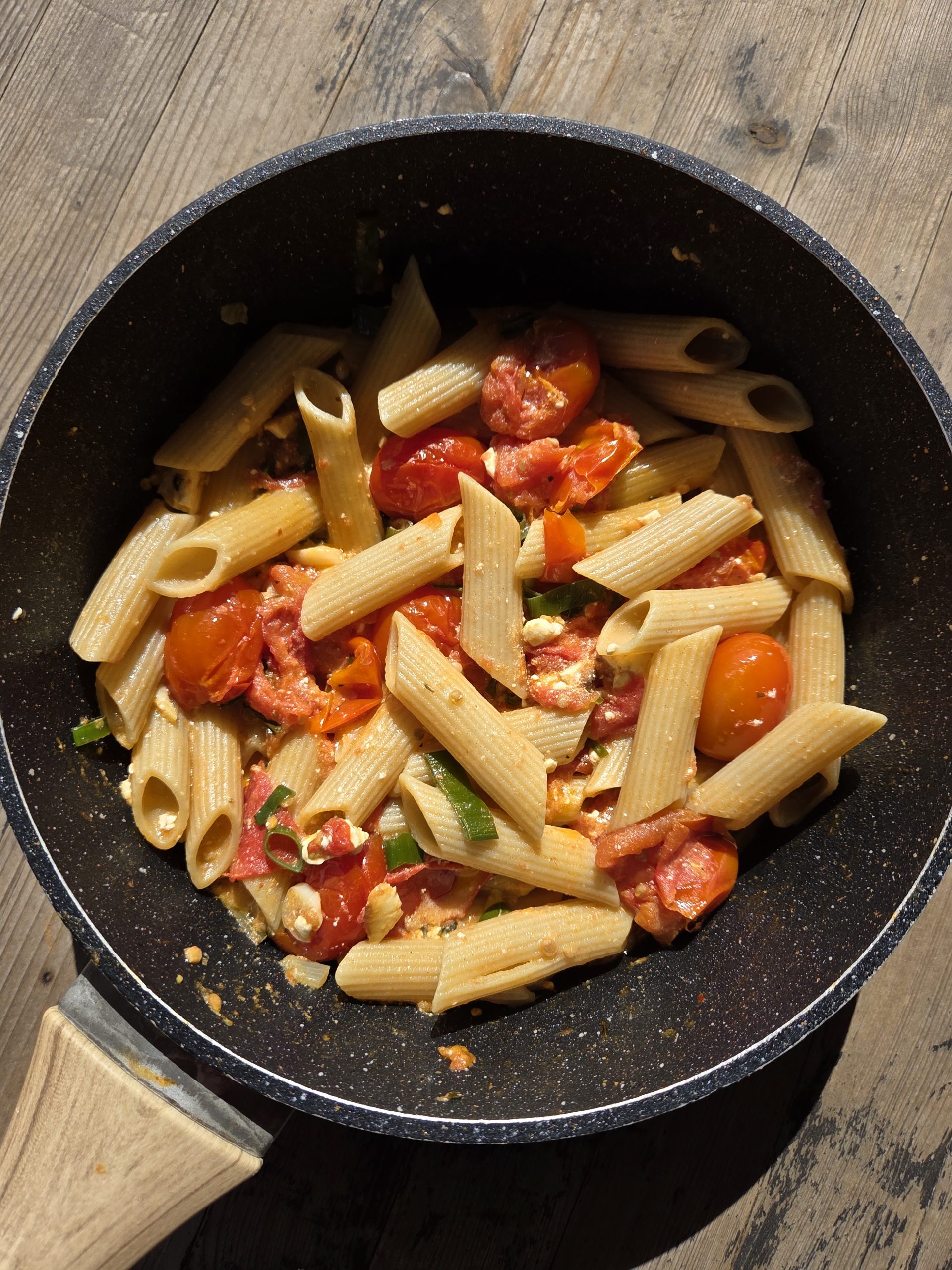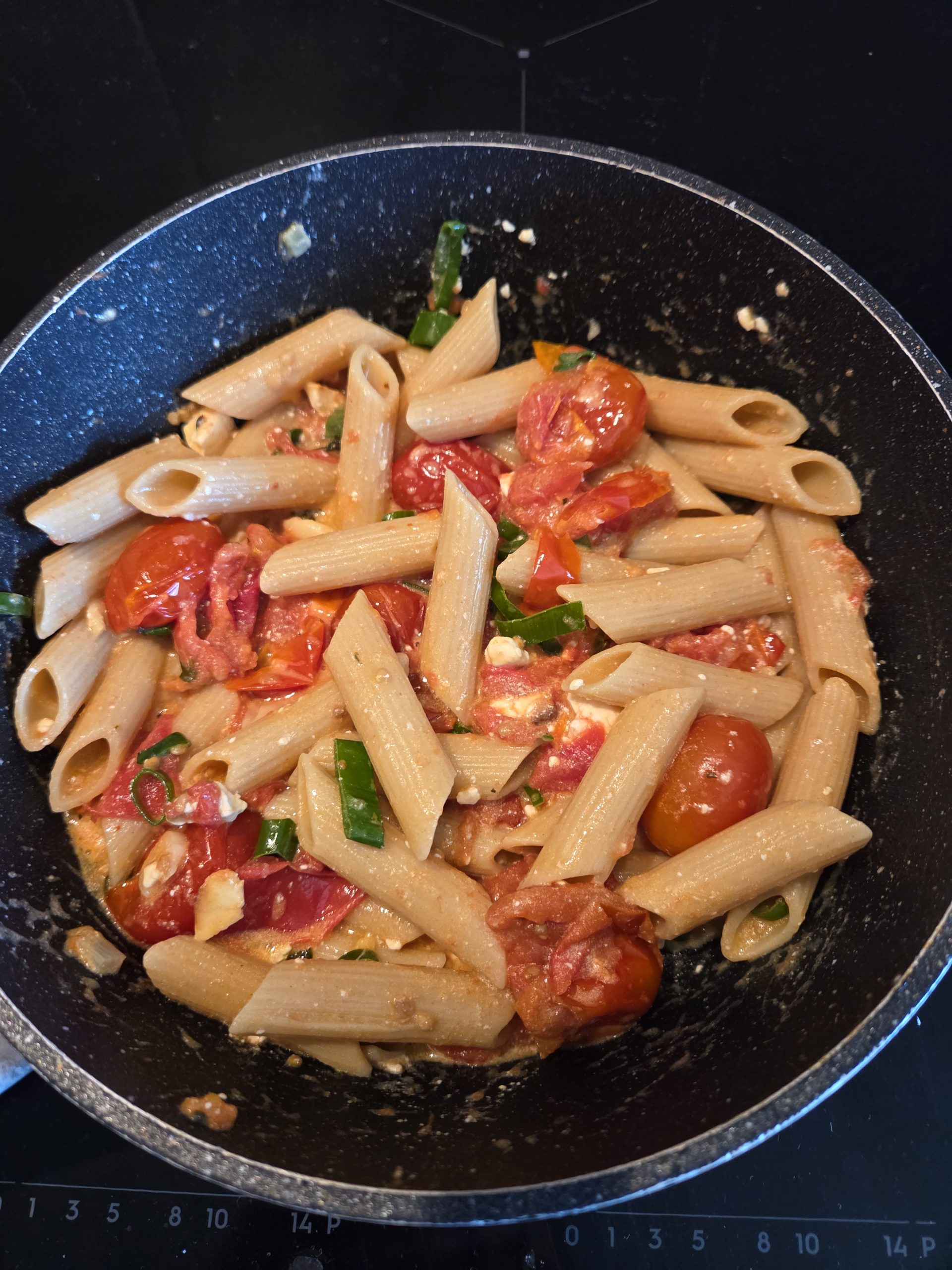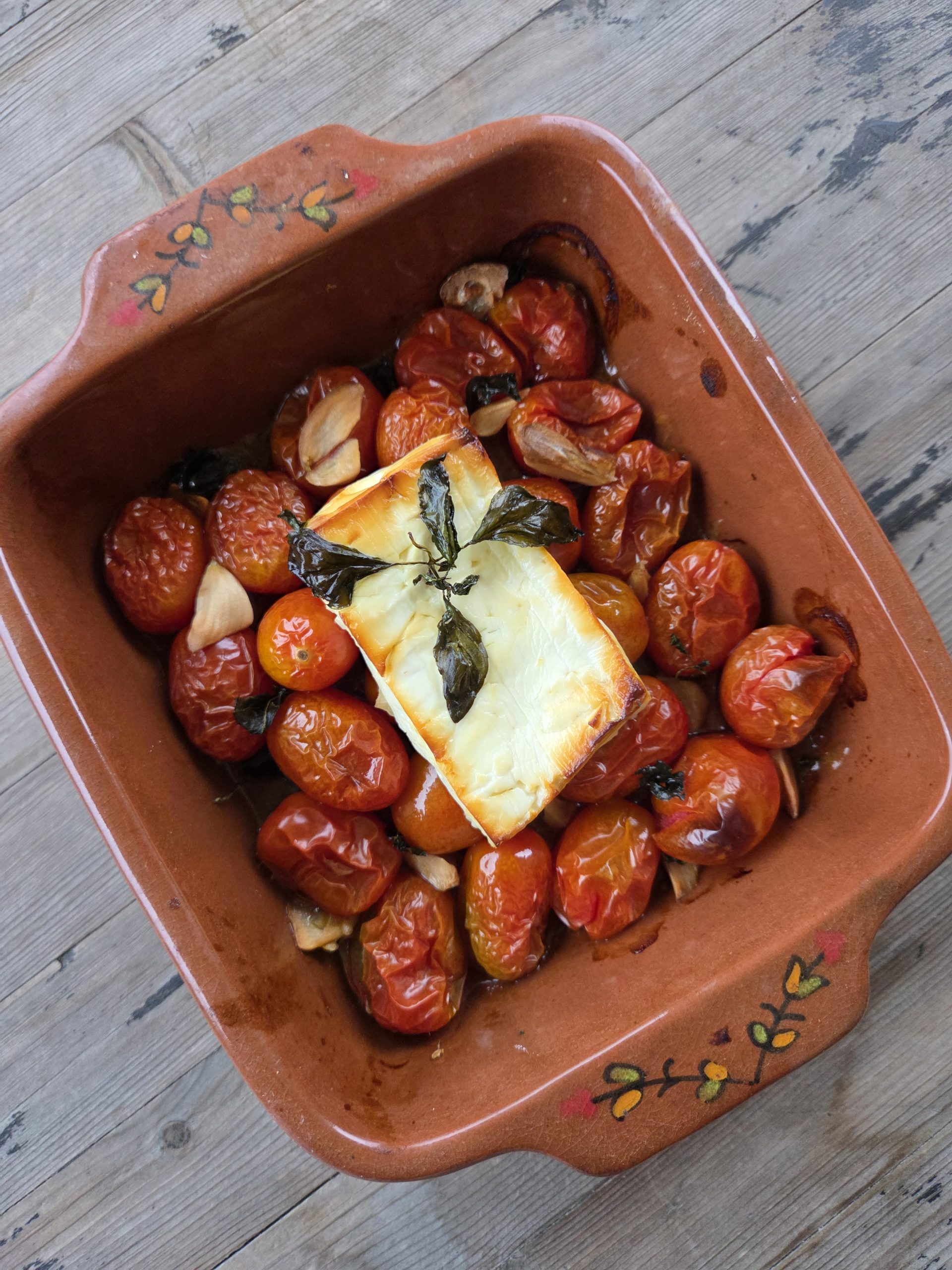 Pomidorki, fetę ułożyć w naczyniu żaroodpornym, skropić drobiną oliwy, doprawić i upiec (ok. 40 min. 180 stopni).