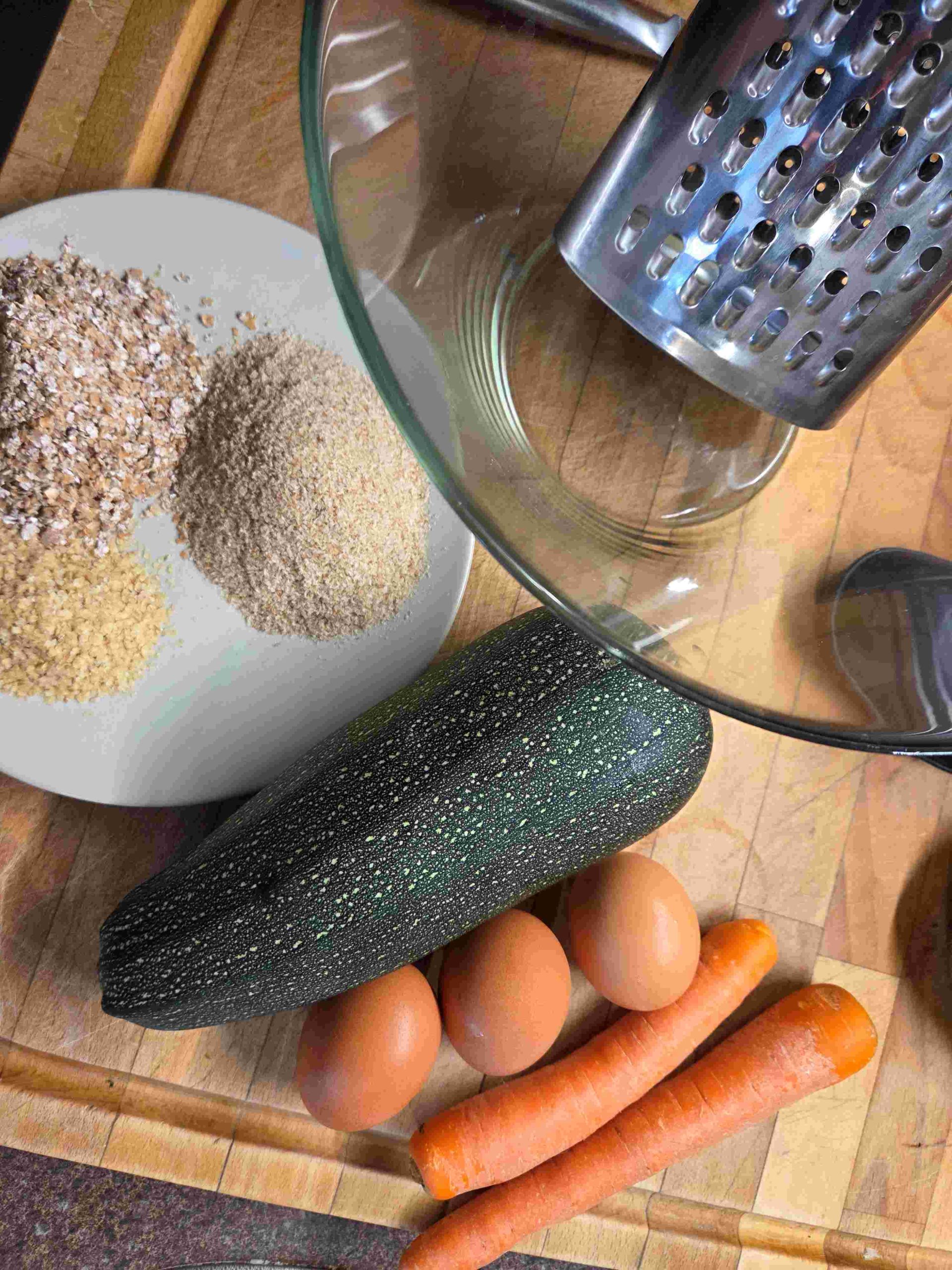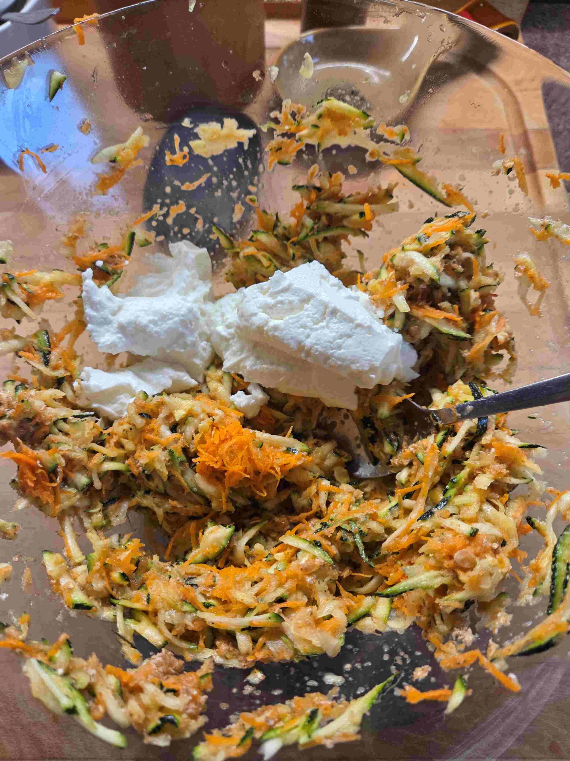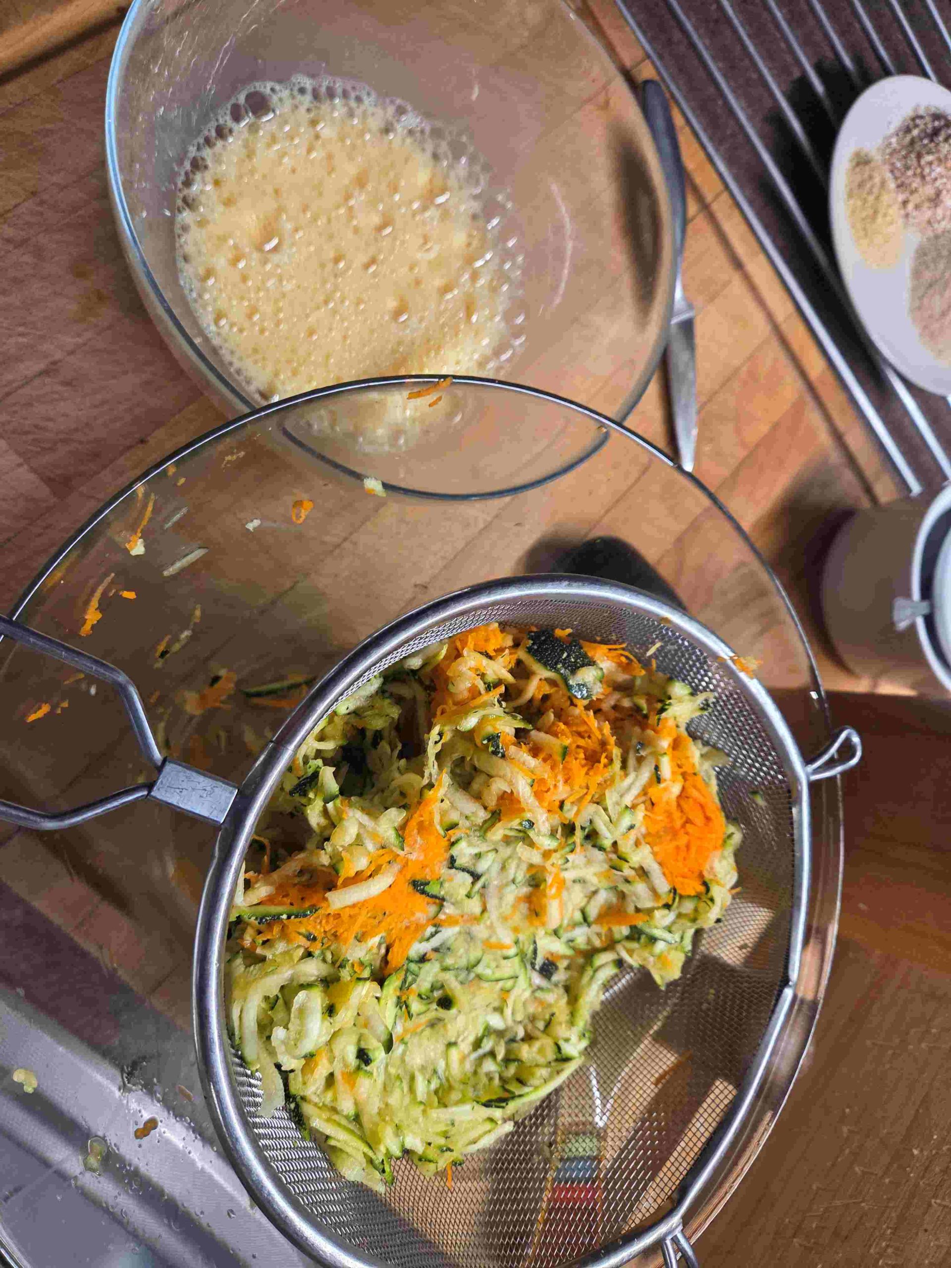 Cukinię i marchwkę starłam na tarce (cukinię na duzych oczkach, marchewkę na drobnych). Posoliłam, wymieszałam i zostawiłam na sitku do odsączenia. Po kilku minutach jeszcze odcisnęłam.