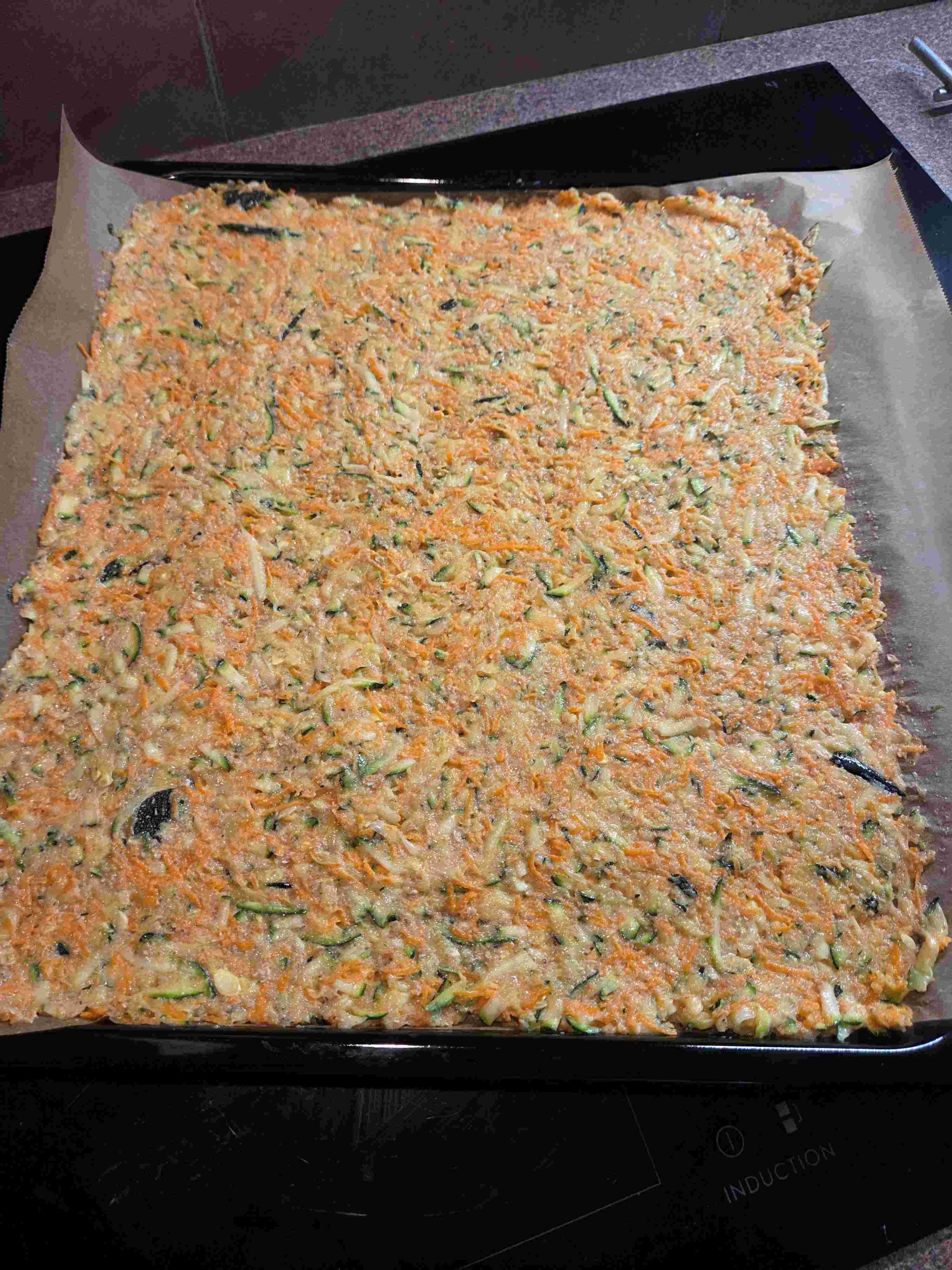 Wyłożyłam na papier do pieczenia, szpatułka rozprowadziłam i włożyłam do piekarnika 200 stopni na 25-30 minut (w zależności od grubości masy potrzeba więcej lub mniej czasu na pieczenie, kontrolujcie to).