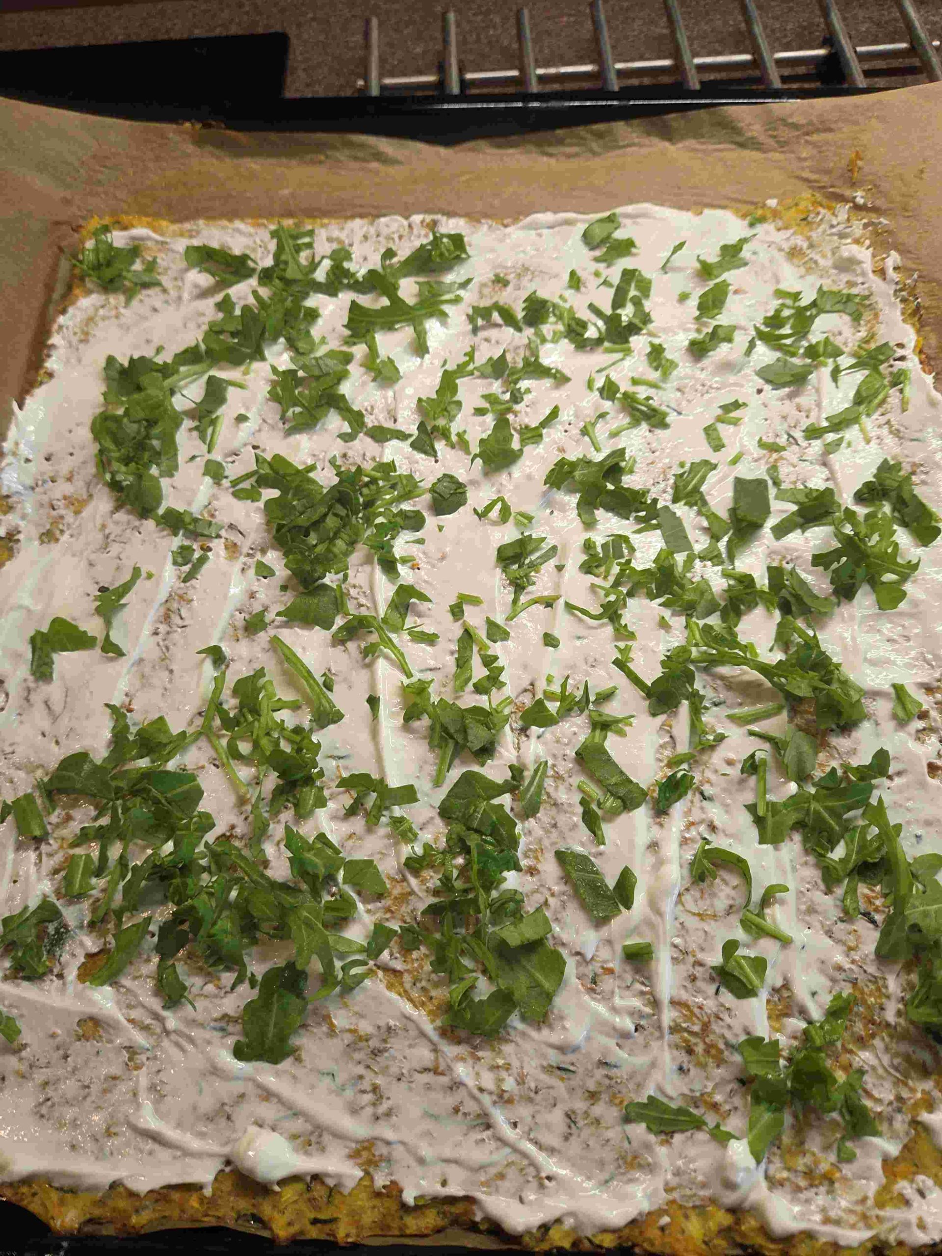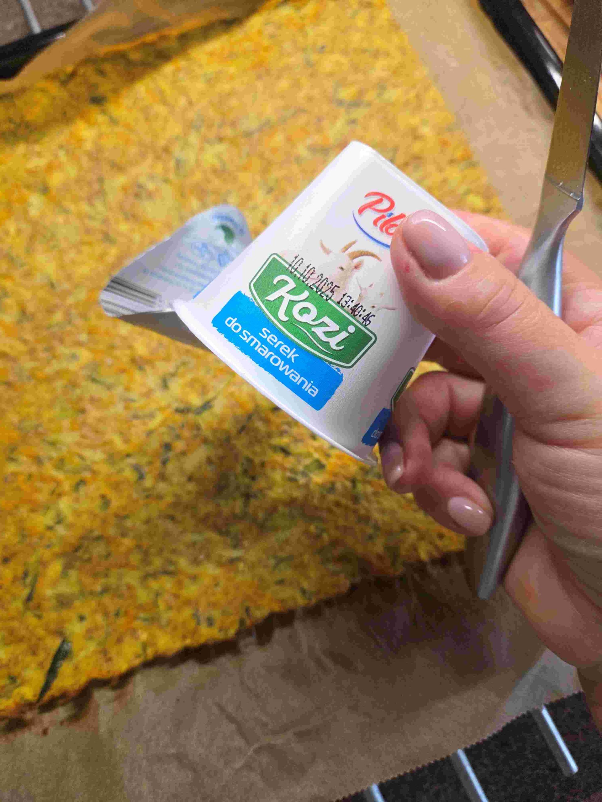 Przestygnięte ciasto wysmarowałam kozim serem...
