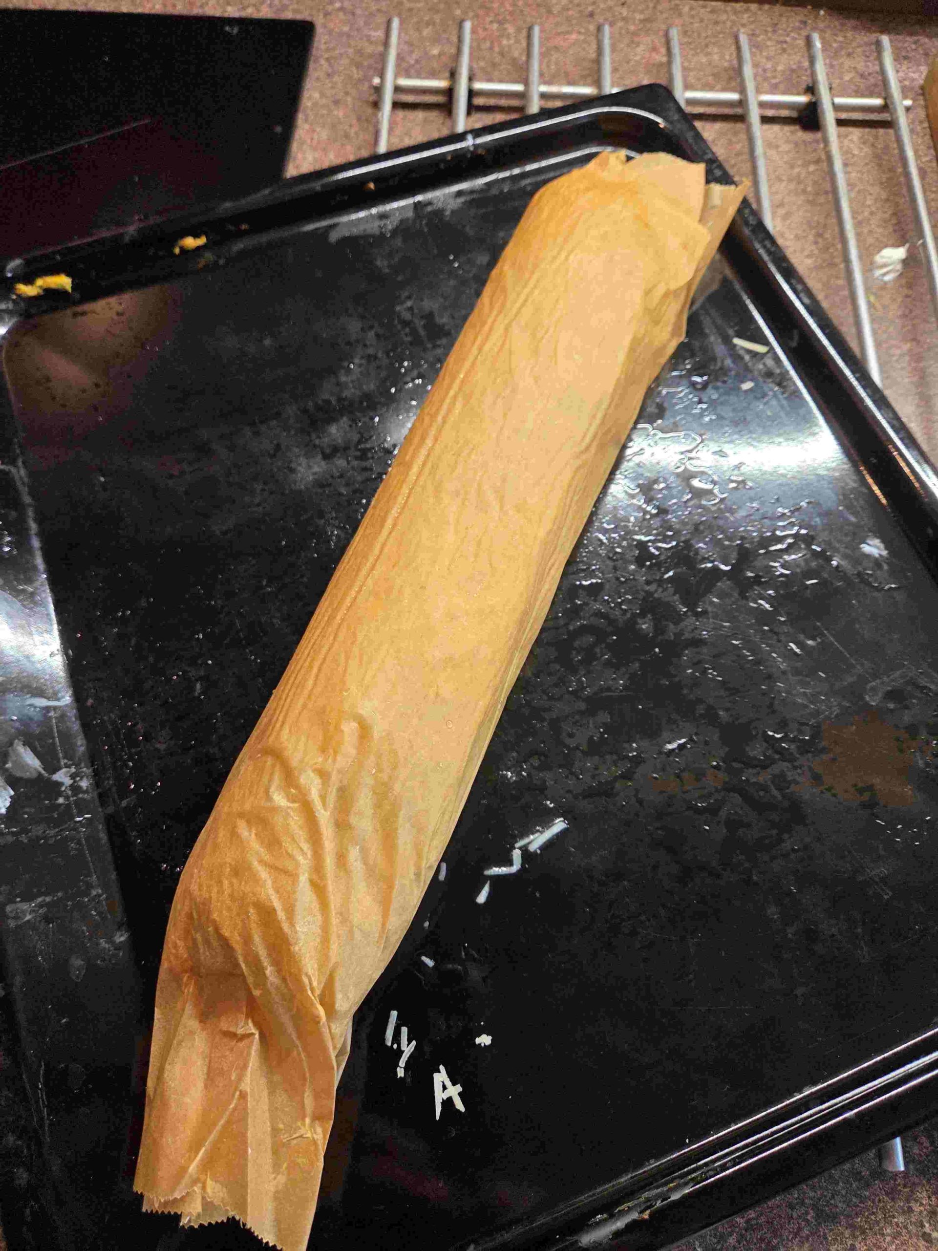 ... i zwinęłam w ciasny rulon pomagając sobie papierem, na którym piekło się ciasto. Wstawiłam do lodówki na noc.