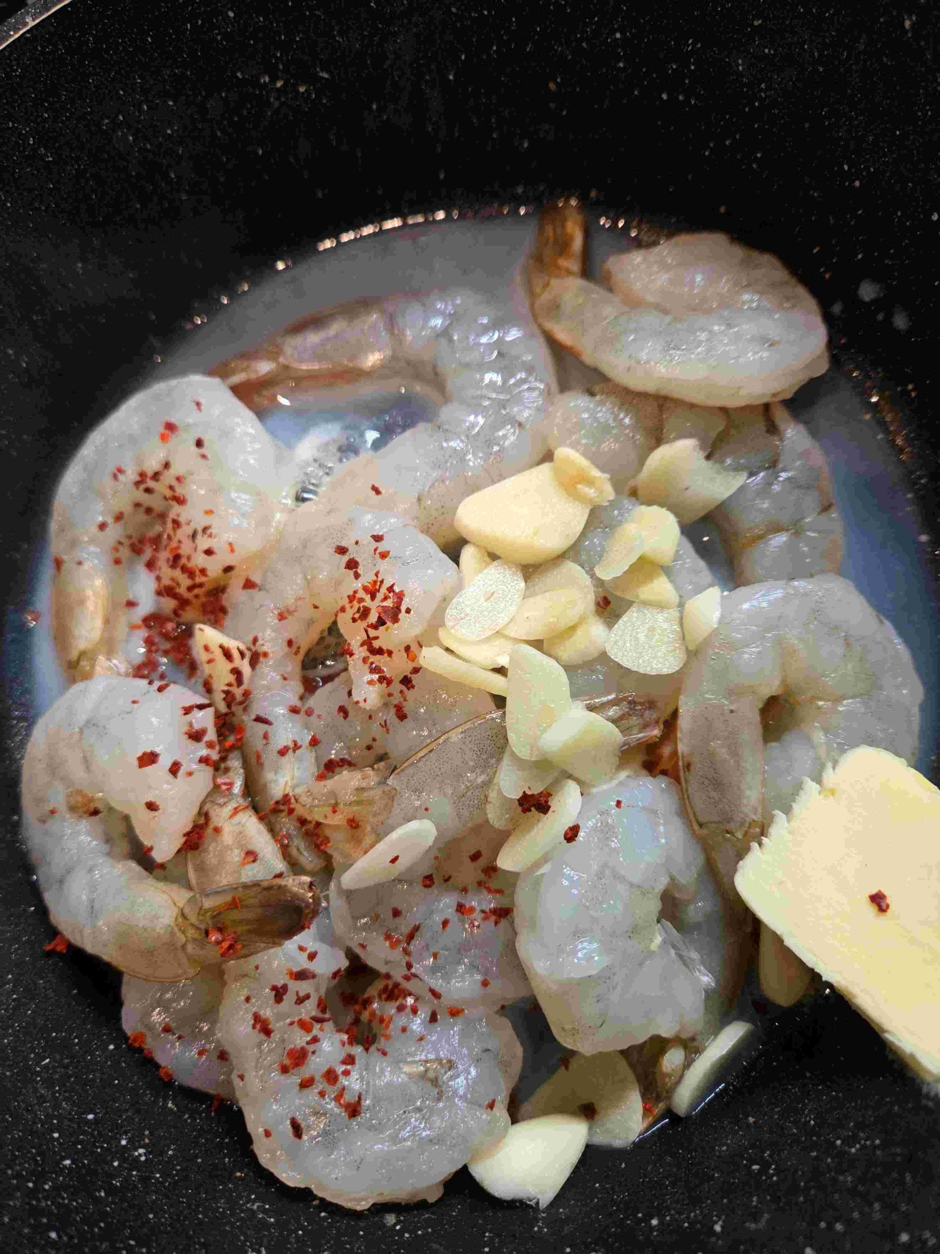Krewetki rozmroziłam (zazwyczaj wyjmuję je przed pracą, jak wrócę to są gotowe do obróbki), wyczyściłam, zostawiłam same ogonki.