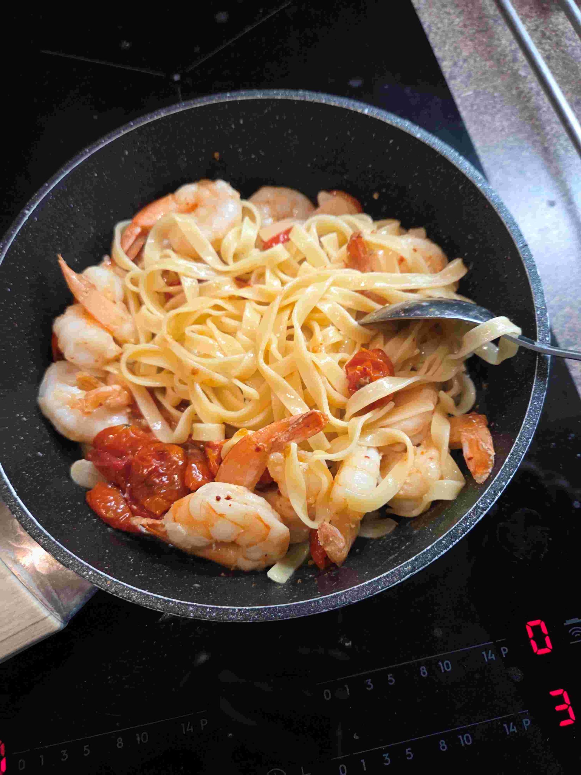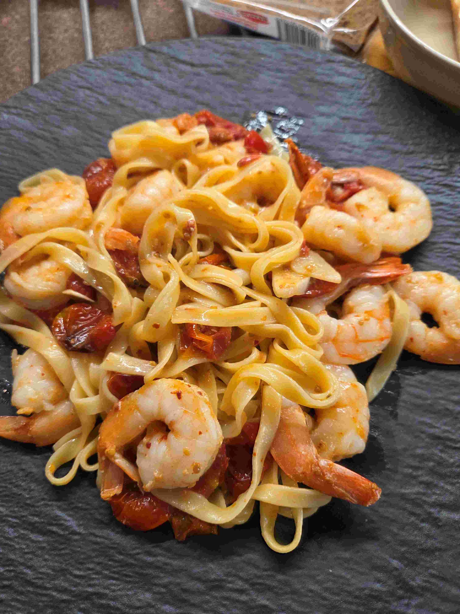 Znakomite połączenie makaronu, krewetek i upieczonych pomidorków koktajlowych. Proste, szybkie danie (o ile macie już wcześniej upieczone pomidorki). Solidna porcja białka więc szczególnie polecam jako posiłek po treningu.