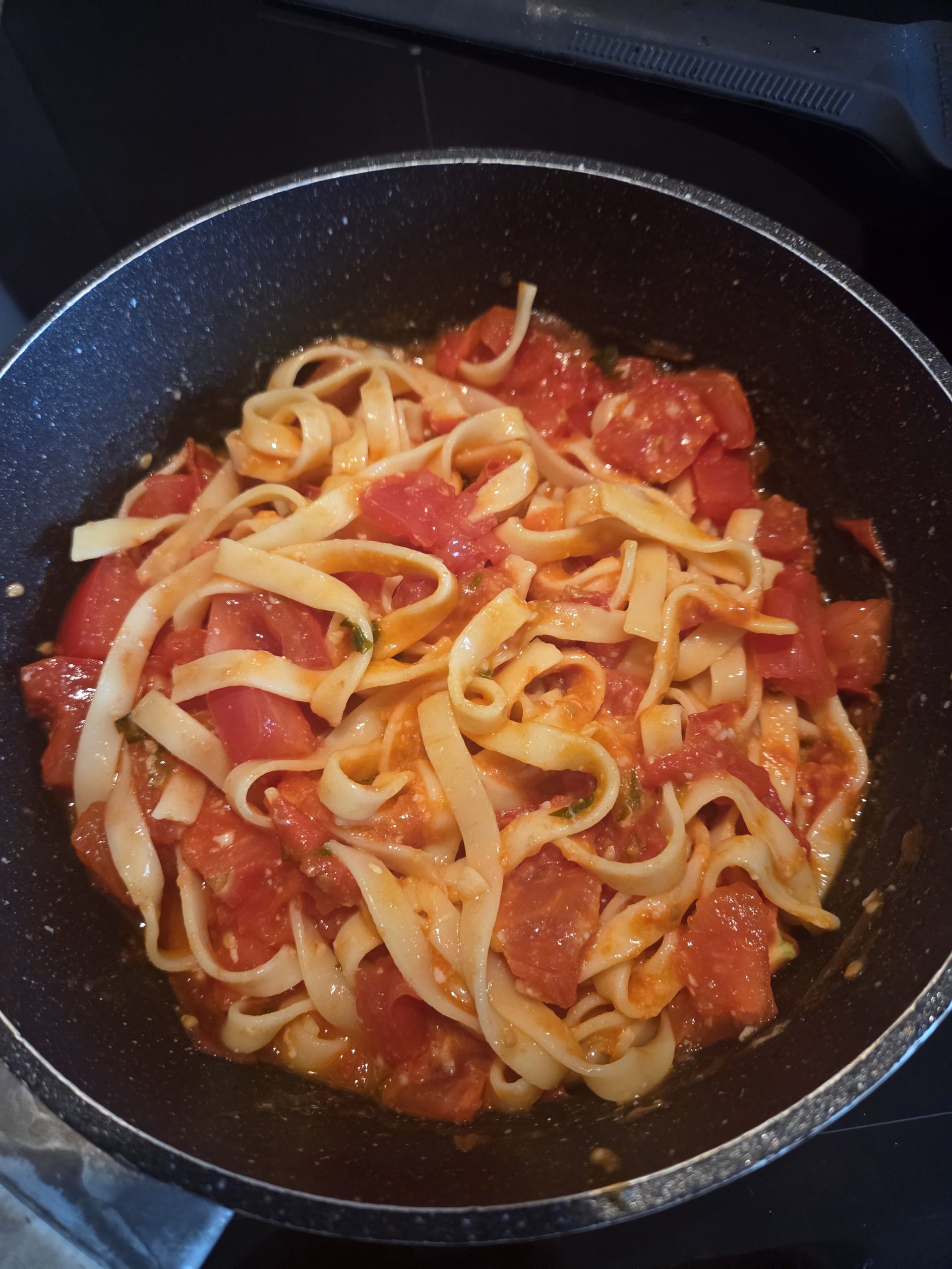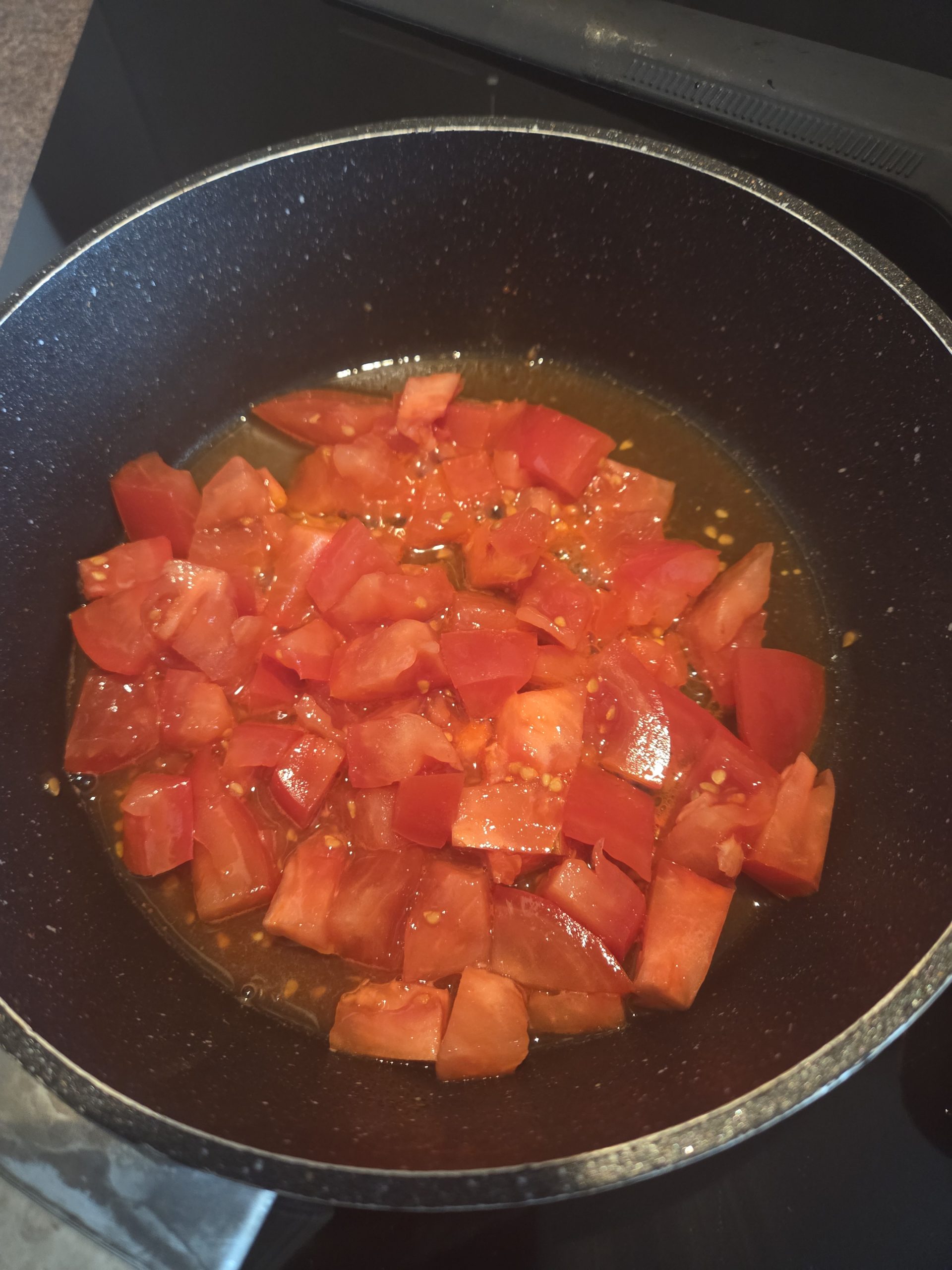 Pomidory pokroiłam w kostkę, dodałam czosnek w plasterkach. Dodałam sół i pieprz, dusiłam kilka minut.